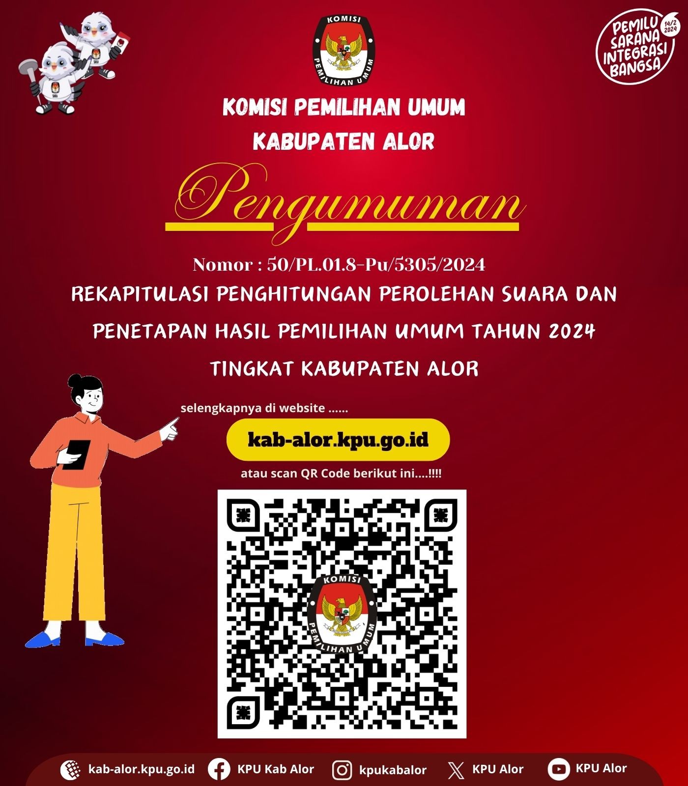 Berdasarkan ketentuan Pasal 55 dan Pasal 57 Peraturan KPU Nomor 5 Tahun 2024 tentang Rekapitulasi Hasil Penghitungan Perolehan Suara dan Penetapan Hasil Pemilihan Umum dan Keputusan Komisi Pemilihan Umum Kabupaten Alor Nomor 541 Tahun 2024 tentang Penetapan Hasil Pemililhan Umum Anggota Dewan Perwakilan Daerah Kabupaten Alor Tahun 2024, KPU Kabupaten Alor mengumumkan Rekapitulasi Hasil Perhitungan Perolehan Suara dalam Pemilihan Umum Tahun 2024, selengkapnya dapat dia akses pada barcode atau link