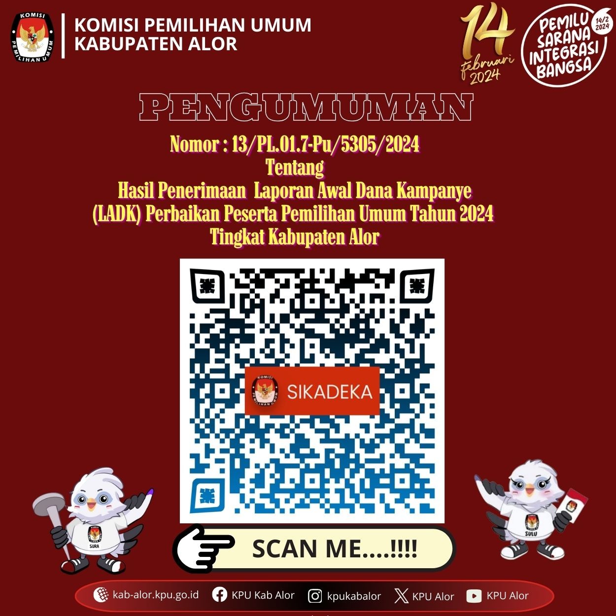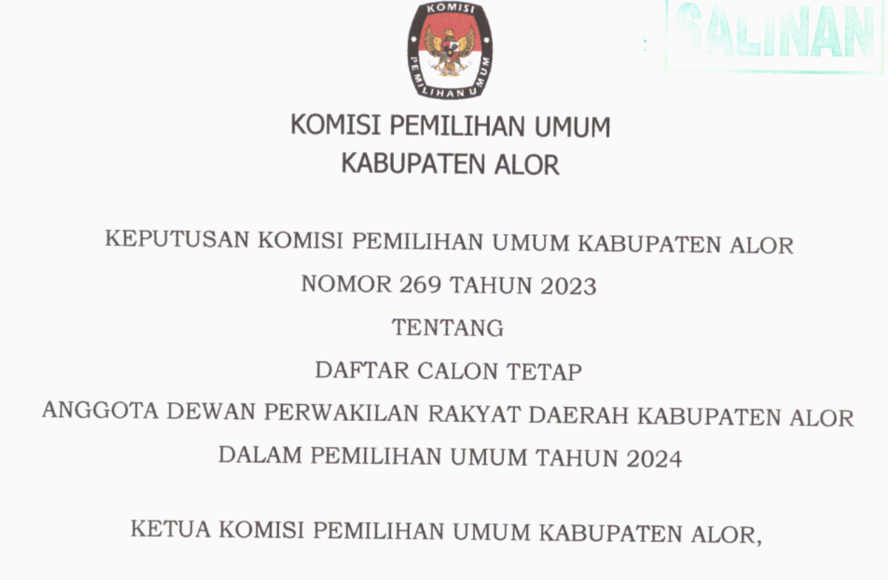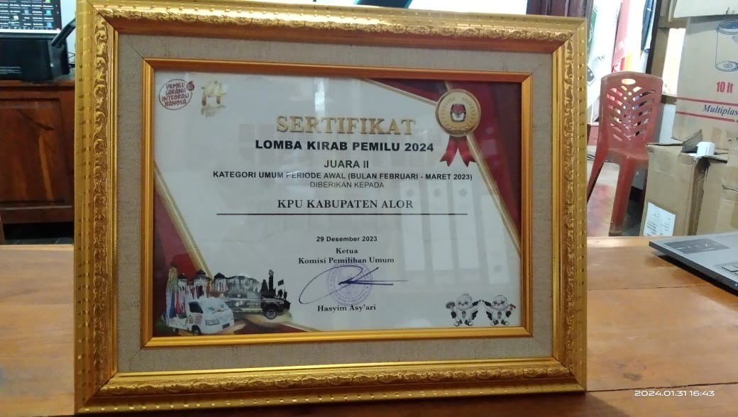 Dalam Konsolidasi Nasional (Konsolnas) pada 28 sampai 31 Desember 2023 di Istora Senayan Jakarta, KPU Alor dinobatkan sebagai Terbaik Kedua Kategori Umum Kirab Pemilu 2024. Ketua Divisi Sosialisasi Charlemen Djahadael mengaku kaget atas pencapaian tersebut. Dirinya tidak menyangka KPU Alor mendapatkan penghargaan bergengsi itu. “Jujur saya tidak percaya. Bertengger di posisi dua nasional dari banyak kabupaten kota yang dilalui kirab pemilu adalah suatu yang jauh dari target kami,” kata Djahadael. “Kami hanya berupaya tampil maksimal dengan memanfaatkan semua potensi yang ada,” lanjut Djahadael. KPU Alor menerima Kirab Pemilu dari KPU Kabupaten Belu pada Sabtu, 18 Maret 2023, menggunakan kapal very ASDP. Pengantaran rombongan kirab Pemilu tersebut dipimpin langsung Ketua KPU Belu Mikhael Nahak dan Ketua Divisi Hukum Yakobus Fahic Nahac. Ketua Divisi Sosialisasi KPU NTT Yosafat Kolly dan Sekretaris KPU NTT Adiwidjaya Bakti ada dalam rombongan tersebut. Djahadael memimpin tim kirab pemilu melakukan sosialisasi di pasar-pasar, di pantai wisata, di jalanan umum, bahkan di kampung adat Takpala. Sosialisasi tersebut diselip dengan dengan kuis berhadiah. Kirab Pemilu kemudian diantar ke Lembata dan penyerahannya dilakukan di halaman kantor KPU Lembata pada Kamis, 23 April 2023. Kegiatan serah terima Kirab Pemilu 2024 tersebut dihadiri Ketua Divisi Teknis KPU NTT Lodwyk Fredrik, Sekretaris KPU NTT Adiwidjaya Bakti, Penjabat Bupati Lembata, Ketua DPRD Lembata, Ketua Bawaslu Lembata, pimpinan partai politik peserta pemilu, dan seluruh Panitia Pemilihan Kecamatan se-Kabupaten Lembata.*
