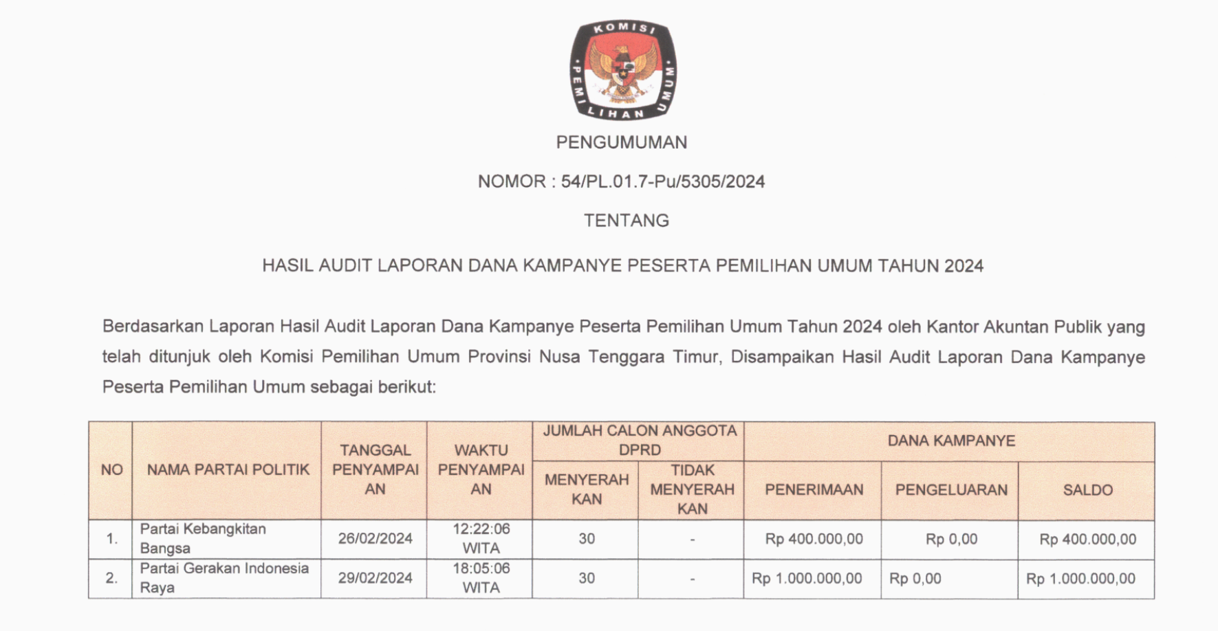 Berdasarkan Hasil Audit Laporan Dana Kampaye Peserta Pemilihan Umum Tahun 2024 oleh Kantor Akuntan Publik yang telah ditunjuk oleh Komisi Pemilihan Umum Nusa Tenggara Timur, disampaikan Hasil Audit Laporan Dana Kampaye Peserta Pemilihan Umum Sebagai berikut : Selengkapnya