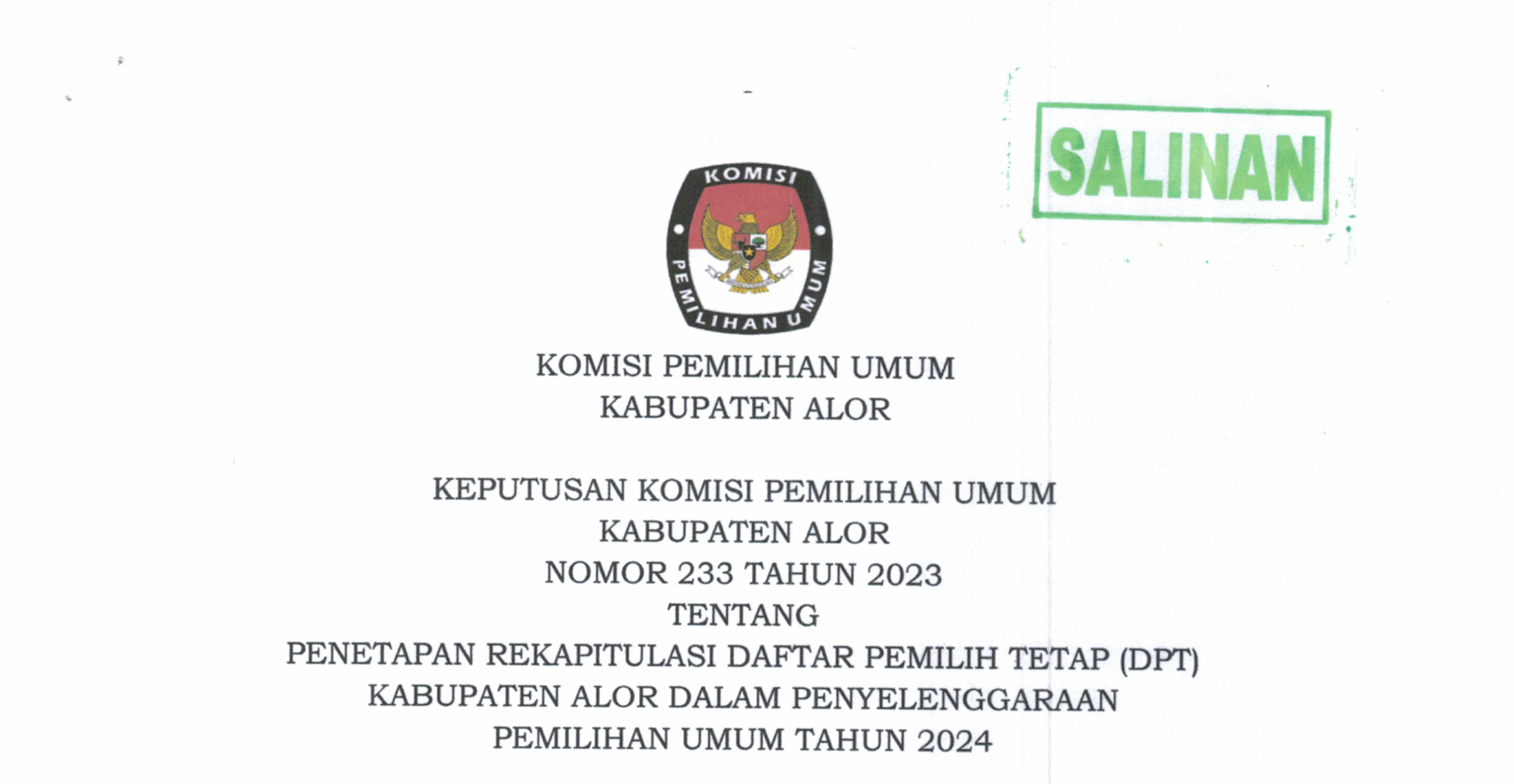 Salinan SK DPT Pemilu Tahun 2024 Salinan SK Daftar Pemilih Tetap Tahun 2024 Share this artikel : Dilihat 123 Kali.